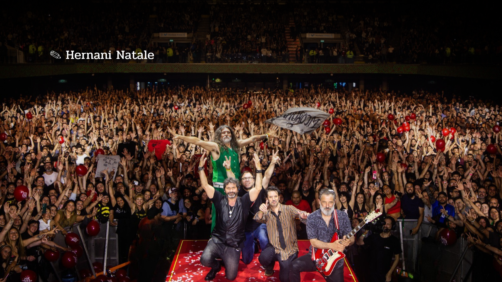 Aludió también a la emoción de estar actuando en una arena joven pero que acumula su historia, luego de un derrotero iniciado en bares y sótanos. Se le hizo los honores al escenario de tamaña envergadura, con un gran despliegue lumínico, una saturación de pantallas y desniveles para la batería, los teclados y los vientos.